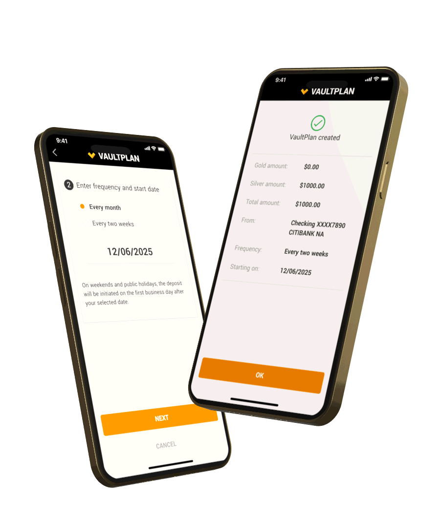 VaultPlan automates your gold and silver purchases so your portfolio grows on autopilot. You choose the amount and schedule.