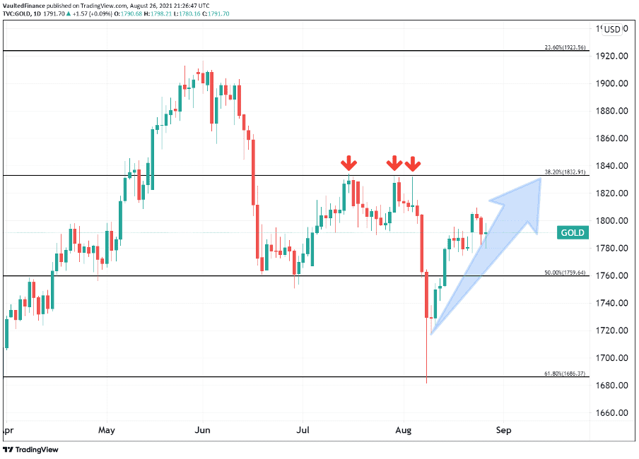 Gold rose from $1,470 in March 2020 to $2,075 in August 2020. Since then, the price has come back and touched the .618 Fib three times, which means it has retraced 61.8% of its gains.