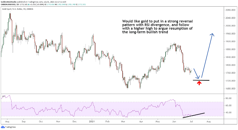 There are several bullish indicators that may delay gold’s third visit to the .618 Fib line (or cancel it altogether). The purple line on the chart below measures gold’s Relative Strength Index (RSI). RSI is a momentum indicator used to analyze when assets are overvalued or undervalued. When RSI drops below the light purple range, like this week, the indicator suggests that gold is undervalued. Low values on the Relative Strength Index make for strong entry points.