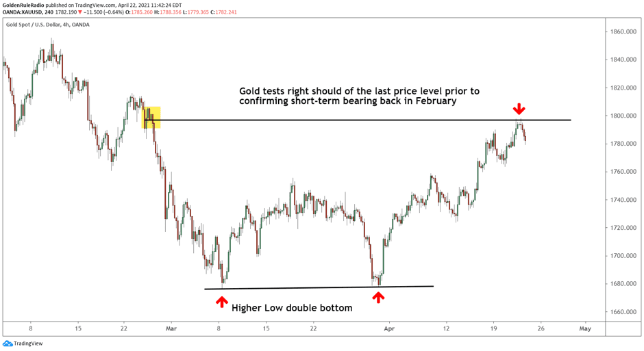 Gold tested the $1,800 price level yesterday after climbing steadily the entire month of April. In late March, gold bounced off a key level of $1,680 for the second time. Three weeks ago, we predicted this could be a double bounce that marked the bottom of gold’s short-term bear market. We are now getting confirmation of the prediction with each new rally in the gold price.