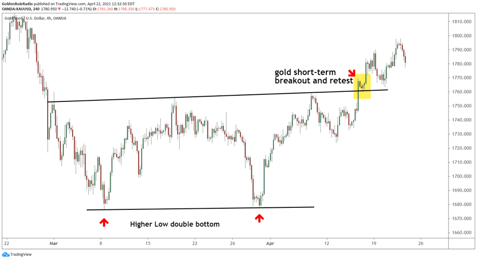 Gold has retested the $1,760 line twice since the breakout last week, both times failing to push below. The upward stair-stepping pattern is a great sign for investors who entered the market in the last two months.