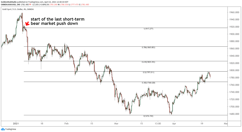 Gold is now testing the 50% line from the start of the short-term bear market that began in January 2021. The .618 fib is around $1,831, so we would expect to meet resistance at this level. On the chart below, you can see where the .618 fib lines up with a few price action points as gold was moving down through February.