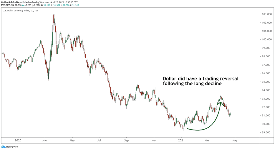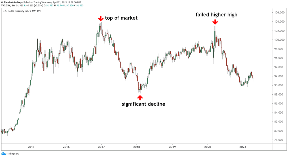 In fact, the dollar has been in a downward trend since 2017. The index failed to put in a higher high last year, sending the currency on a downward trajectory that is unlikely to end anytime soon.