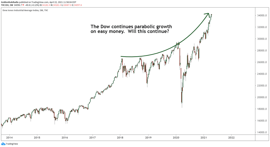Here’s a question we should all be asking: does the Federal Reserve have enough power to overcome the natural movement of the markets? Judging by stock market performance following the COVID-19 crash a year ago, it certainly seems so. Record quantitative easing, stimulus measures, and near-zero interest rates have pushed equities markets higher than anyone ever thought possible during a worldwide pandemic. Just look at the Dow Jones performance dating back a few years:
