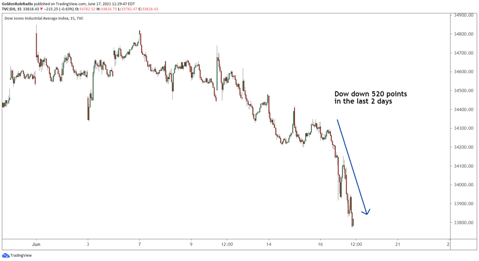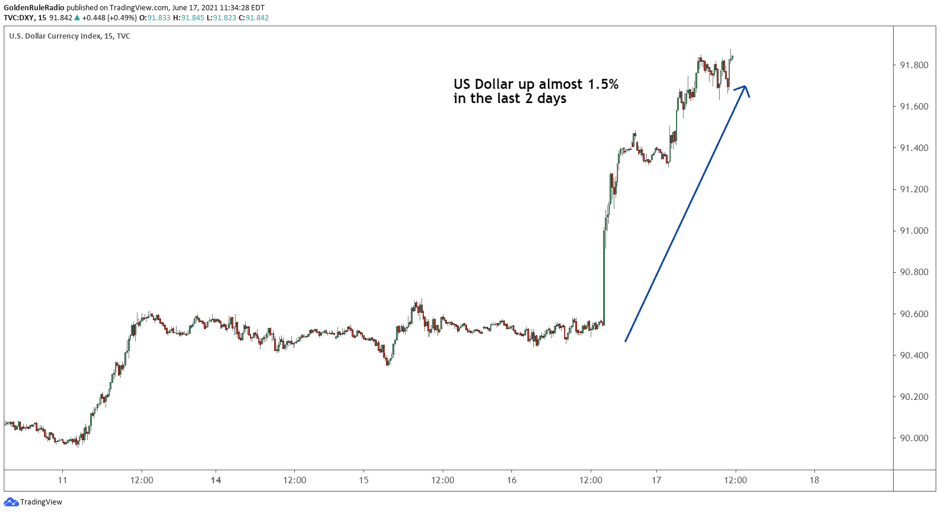 Gold peaked at $1,914 this month after two months of very strong gains. The tides turned against gold following Wednesday’s FOMC meeting, during which the Fed moved up the estimated timing of their first interest rate hike. Inflation trades took a hit. This steep reaction is surprising, considering the Fed still plans to keep interest rates near zero for another 2 years.