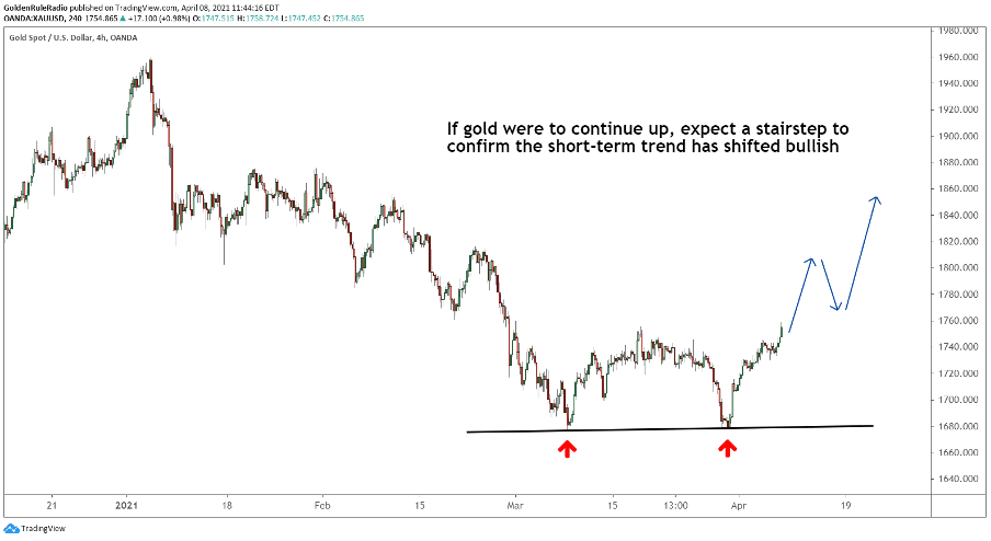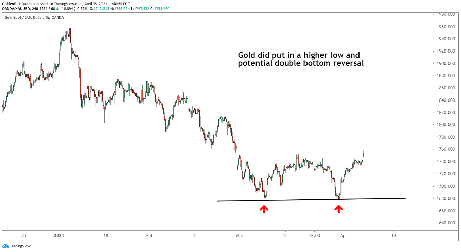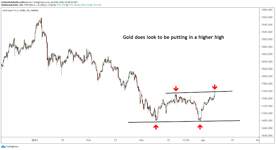 Higher lows and higher highs are the primary characteristics of bullish price action. On March 30th, gold put in a slightly higher low. The price has now reached a higher high of $1,756 following the bounce, which is a positive sign for continued gains.