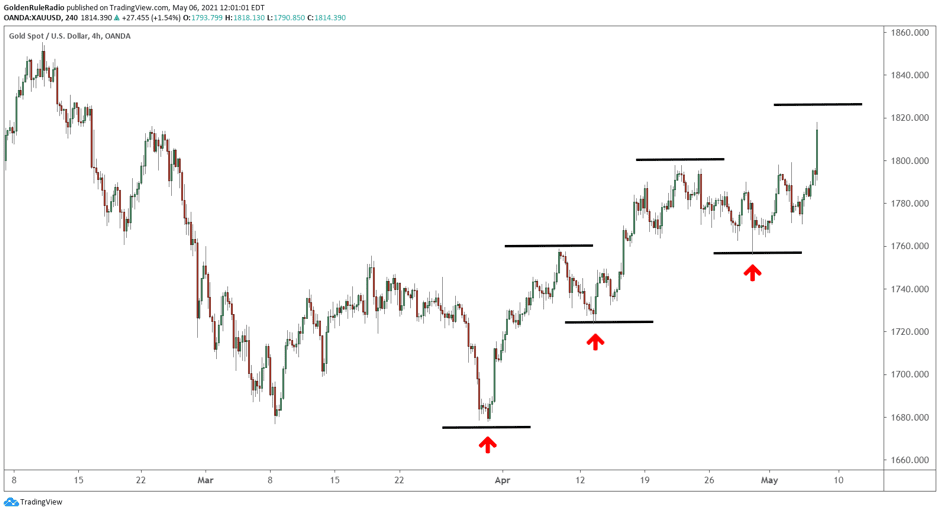 - After its double bottom in March, gold has embarked on a strong upward stair-stepping pattern.