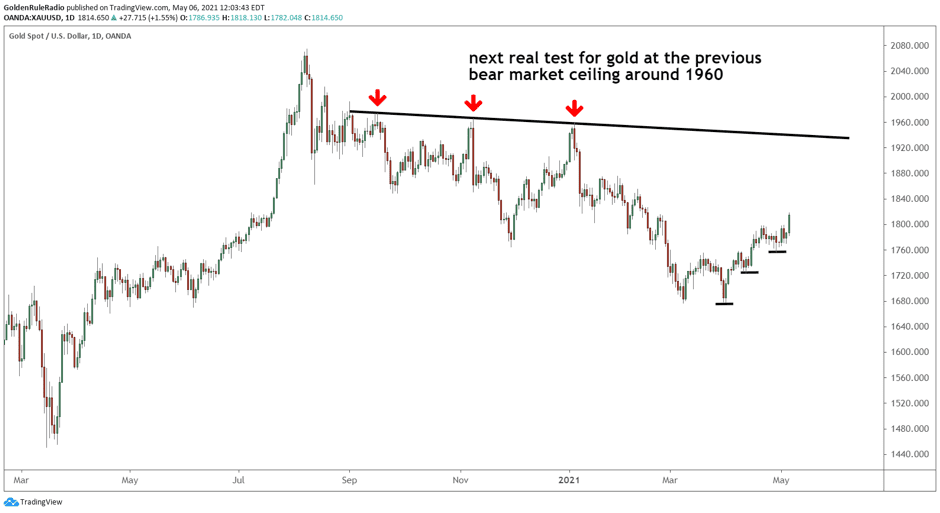 We would like to see the price continue to stair step up and test the previous shelf we put in last summer, right after gold reached all-time highs. This level lies right around $1,960. After that, we can start discussing new all-time highs.