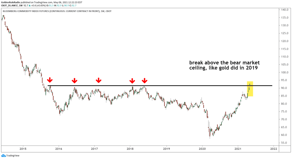 - The Bloomberg Commodities Index just pushed above its bear market ceiling dating back to mid-2015. This is a major signal of incoming inflation, but a great sign for commodities investors.