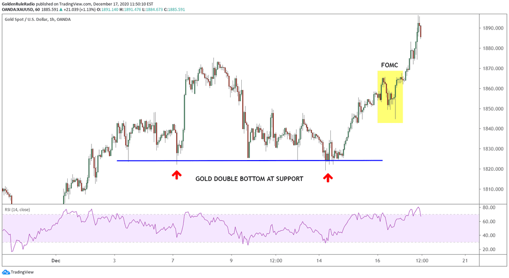 Gold has hit a double bottom on a key support level and now looks to be climbing in response to the FOMC meeting minutes.