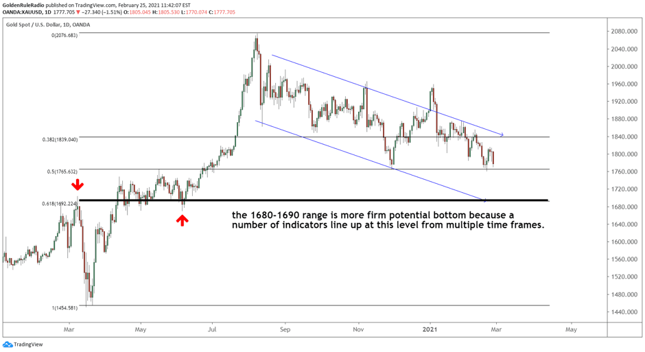 Gold hit a double bottom this week at the 50% correction line around $1,762, but the technicals indicate we still have further to drop. Until gold starts putting in higher highs and higher lows, we are not calling a bull market transition.