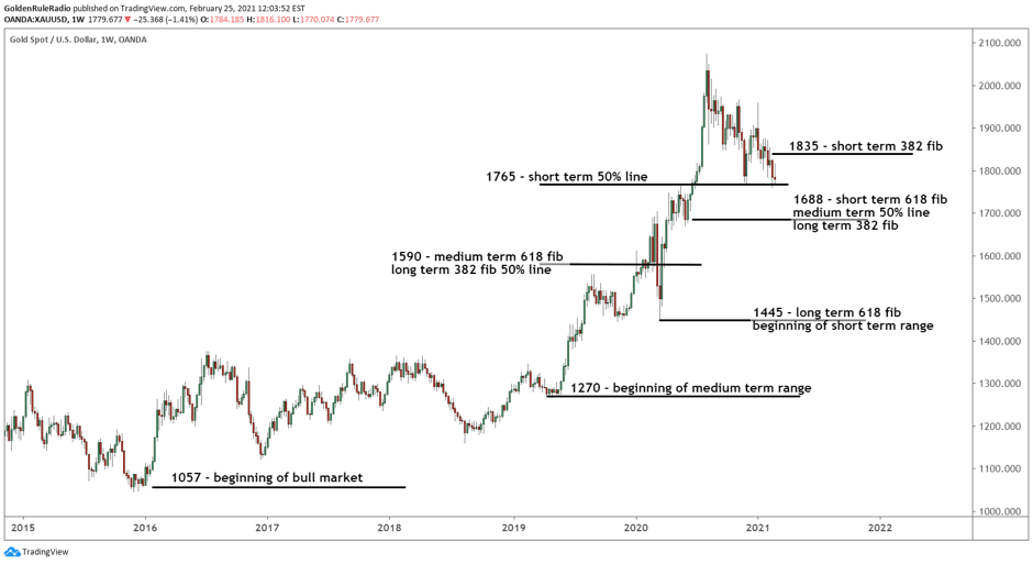 Let’s step back and look at gold’s performance since 2015, which marked the beginning of gold’s third great bull market. The key support and resistance levels shown in the chart above are based on the 2020 price movement. However, there are many other key levels in this 5-year bull market that give greater clarity on gold’s long-term trends (shown below).