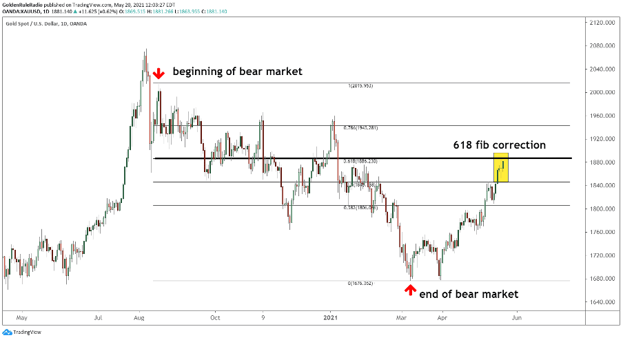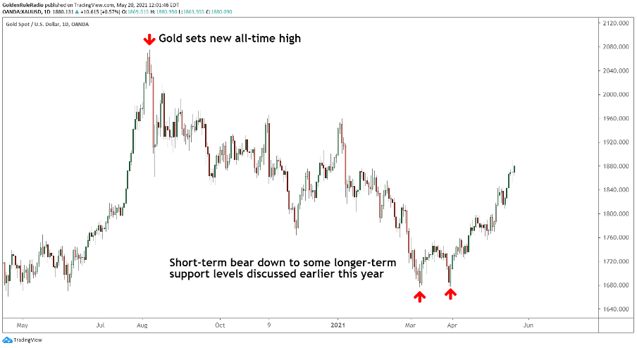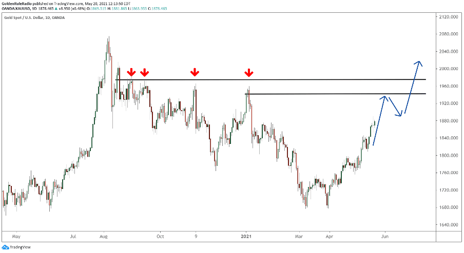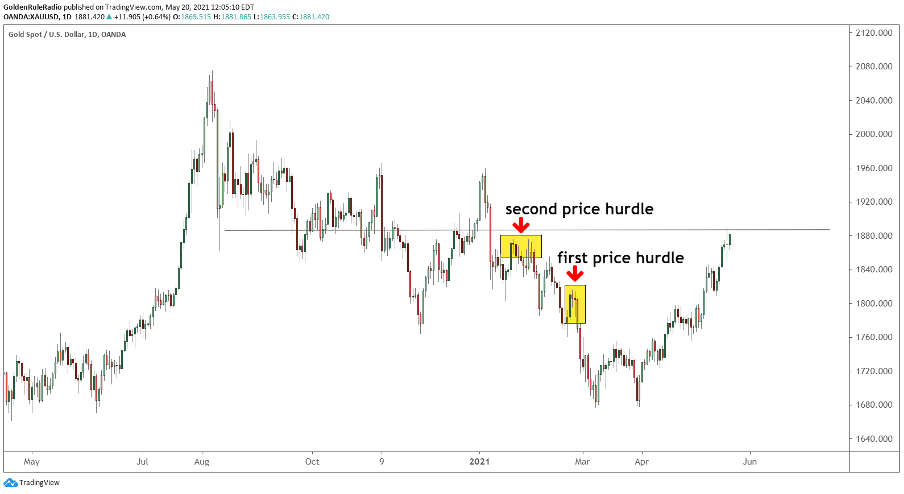 $1,885 also corresponds to an important hurdle we saw earlier in 2021. Gold broke through the first hurdle on May 7th, which was around $1,815. If gold breaks confidently above $1,885, we would like to see it turn around and bounce off that level before moving higher, just like it did at $1,815 on May 12th.