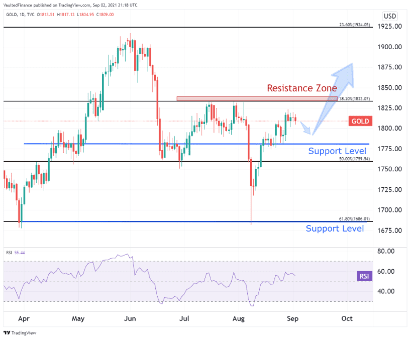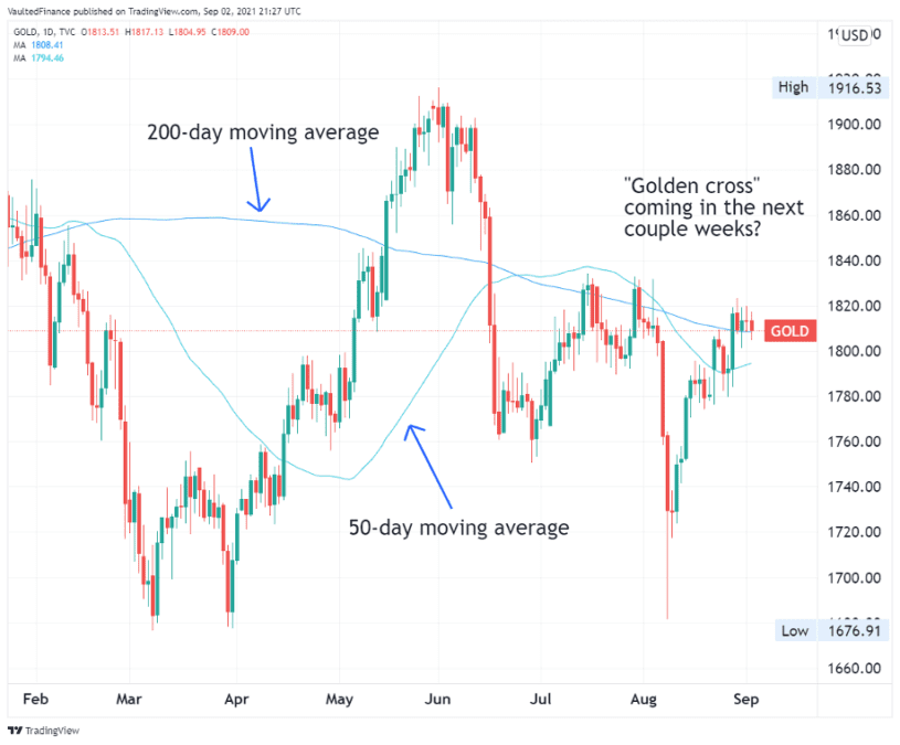 - Gold’s 200-day moving average and 50-day moving average are headed for a “golden cross,” which might be enough to push gold above the $1,837 resistance zone.