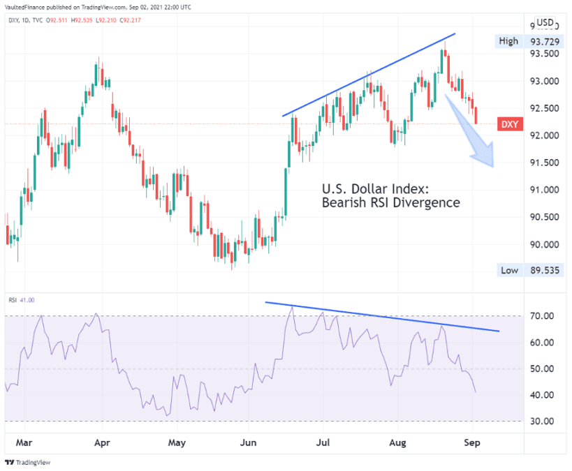 A technical analysis of the U.S. dollar index confirms Goldman Sachs’ prediction. Since mid-June, the index has been putting in higher highs while the RSI puts in lower highs. This is known as “Bearish RSI Divergence,” and usually signals a reversal.