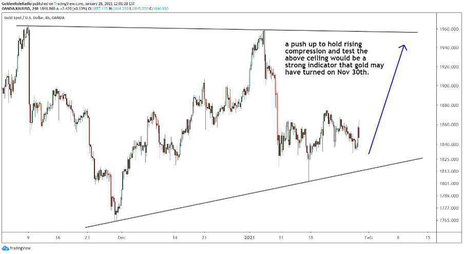 From a technical standpoint, we continue to get confirmation that November 30th was the seasonal low. If gold continues to hold its support levels, we expect to see the price climb toward $1,885 over the next few weeks. We are anxiously awaiting the moment gold decides to climb up and retest its old highs in the mid 1,900’s. Gold’s upward compression is building toward a potential breakout, which will be a telling sign of the metal’s movement in the first half of 2021.